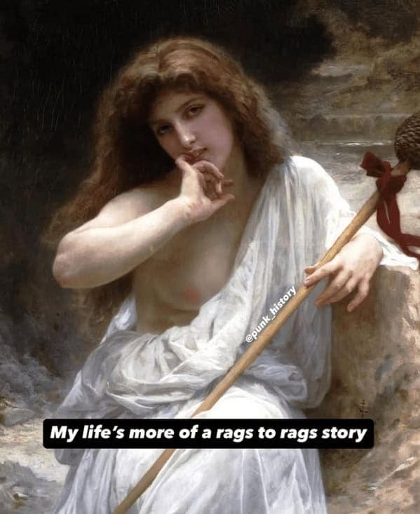 The classical art memes here cleverly juxtapose revered masterpieces against the mundanity and annoyances of contemporary existence. Each of these renaissance memes extracts humor from the otherwise solemn figures in classical and renaissance artwork, transforming stern portraits into comically accurate reflections of everyday life dramas. With subtlety and dry wit, these gens gently mock modern anxieties, failed ambitions, and mundane irritations. They brilliantly recontextualize somber scenes, translating archaic despair into modern, relatable comedic observations. There's no better revenge against art critics everywhere than turning high culture into satirical mirrors of classical art memes reflecting your most petty inconveniences.