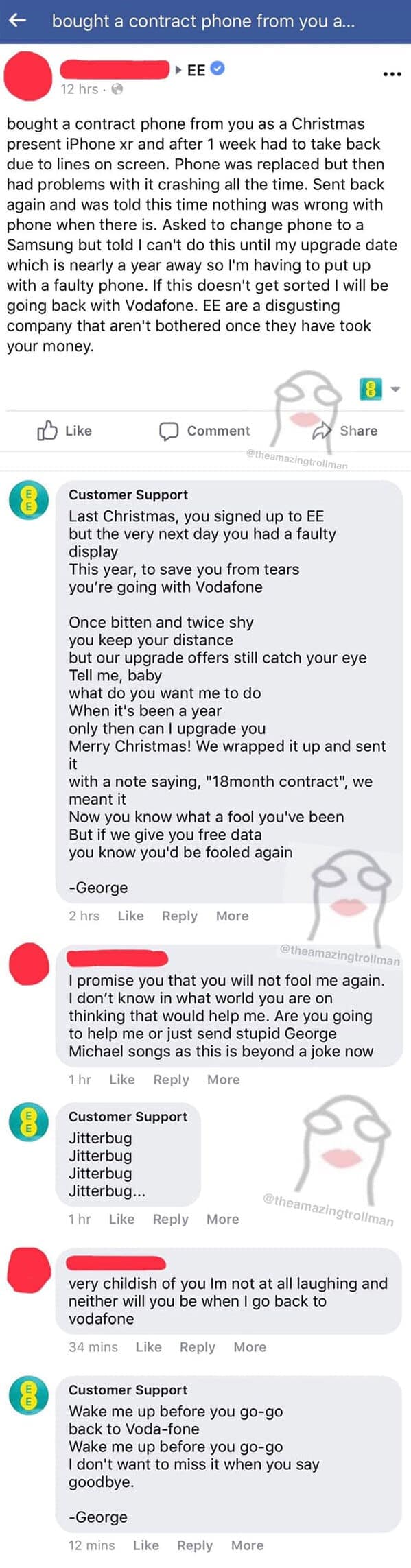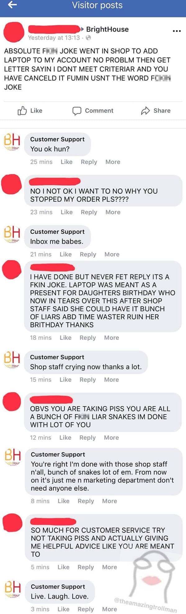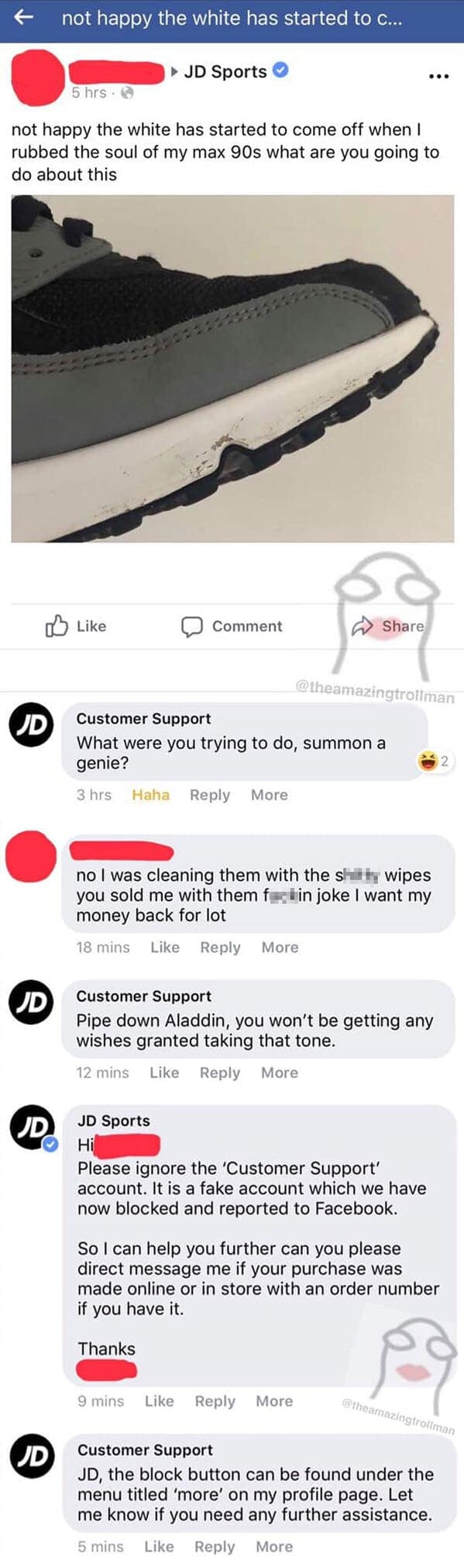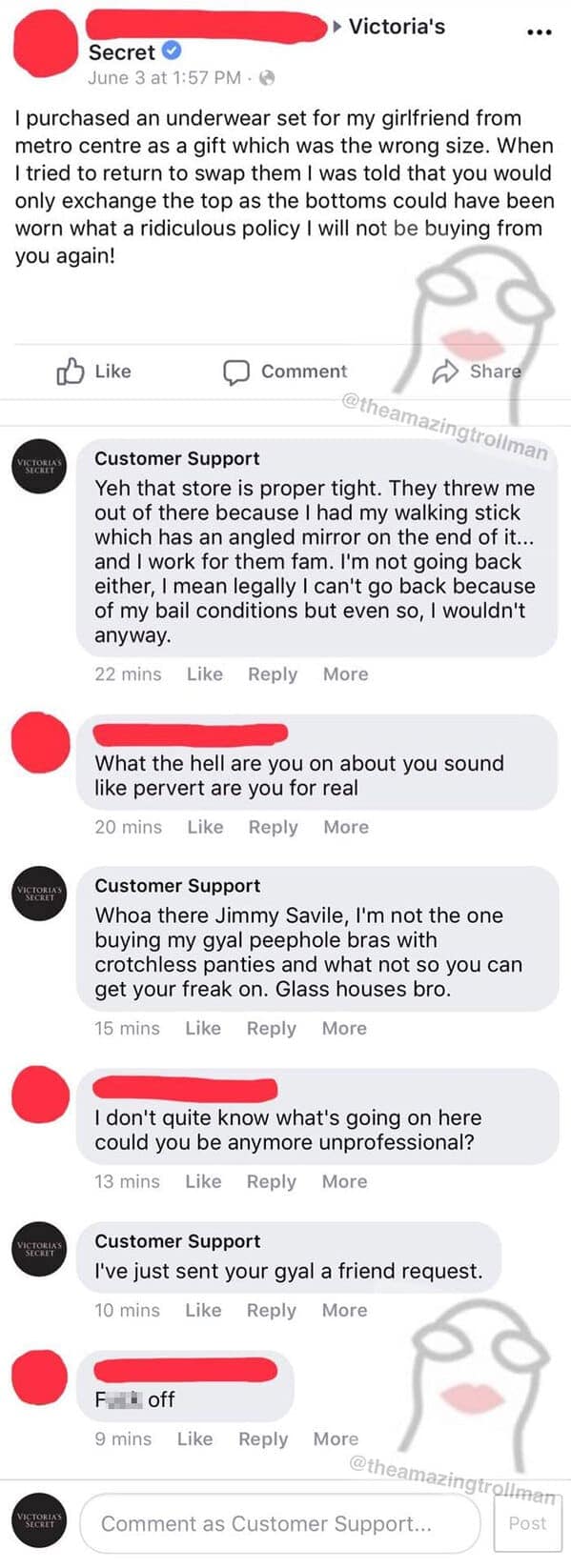 The Amazing Troll Man elevates trolling to an art form, providing "customer support" responses that range from delightfully absurd to genuinely hilarious. This collection showcases some of his best comedic interactions, where confused customers receive bizarrely humorous replies instead of the helpful solutions they expected. His trolling mastery includes witty comebacks, playful misunderstandings, and perfectly timed sarcastic responses. Each screenshot perfectly captures the confusion and eventual realization from customers that they've been brilliantly pranked. You'll appreciate how expertly he balances humor and satire, making everyday frustrations surprisingly entertaining.