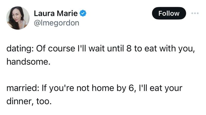 Each of these marriage memes relies on familiarity—two toothbrushes in one cup, take-out menus on speed dial, and that look you exchange when the waiter asks, “Separate checks?” Spoiler: it’s never separate.