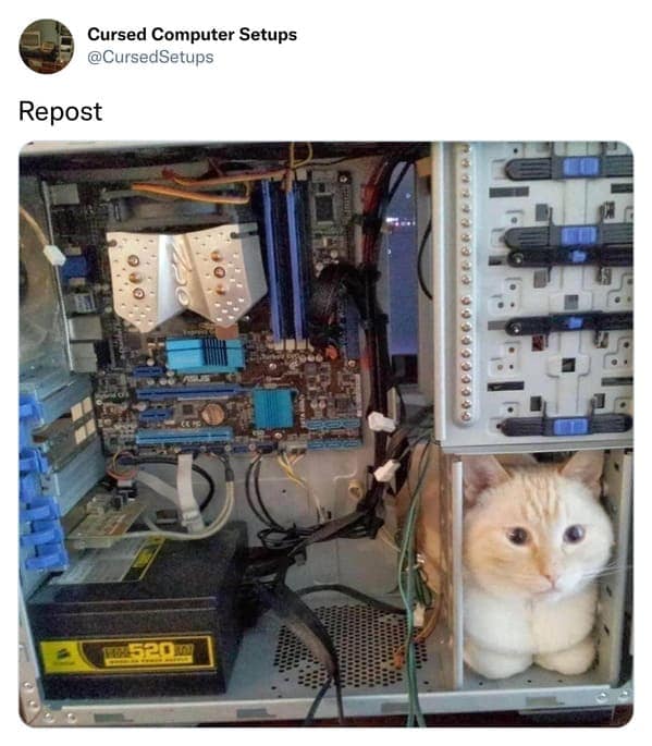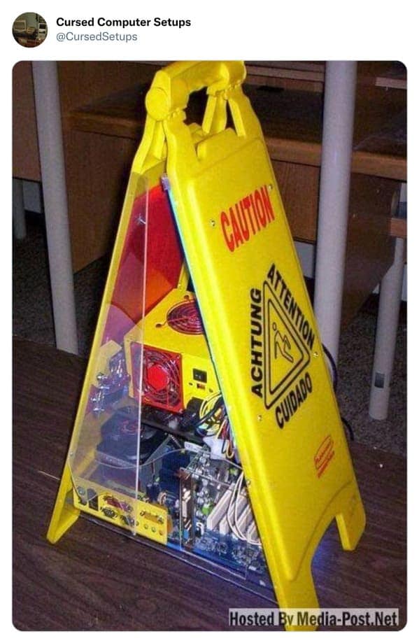 As someone who once balanced a monitor on three textbooks and a hope, I thought I’d seen it all—until the cursed computer setups account slid into my feed. Imagine a desktop tower strapped to a kitchen chair with duct tape while the keyboard rests on a pizza box. Or a monitor that sits in the fridge “for optimal cooling.” These twenty‑five masterpieces of malfunction prove that necessity breeds innovation, and sometimes nightmares. The focus keyword cursed computer setups is your ticket to a museum of tech gone terrifyingly wrong, where USB hubs dangle like holiday lights and every power strip screams for therapy.