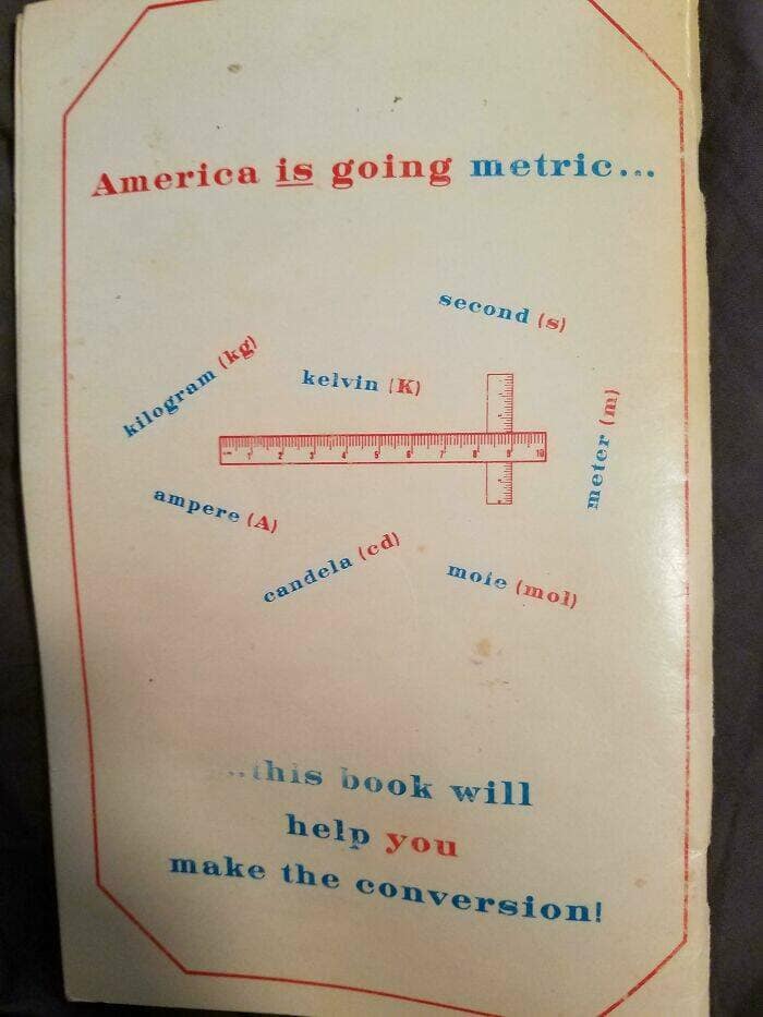 No. 22, going metric. When I was in grade school in the 1950s, I learned that the metric system would replace the imperial system by the time I was out of high school. Also, soccer would be the most popular sport of all.