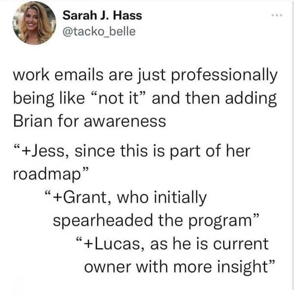 The scroll sprints through every flavor of workplace déjà vu. You’ll skate from funny work memes mocking unread “urgent” flags to zingy office memes celebrating stealth screenshot skills, with a generous ladle of job memes that expose the dark art of looking busy during VPN outages. Humor arrives fast—setup, smirk, swipe—engineered for attention spans reduced by fluorescent lighting. Running gags cover inbox archaeology, calendar Tetris, five-minute breaks that age into mini sabbaticals, and the universal suspicion that Wi-Fi drops only when the boss requests a screen-share. These work tweets never zoom in on oddly specific images; instead they paint flexible caricatures—the over-caffeinated intern, the spreadsheet sorcerer, the manager who thinks “circle back” is deliverable DNA.