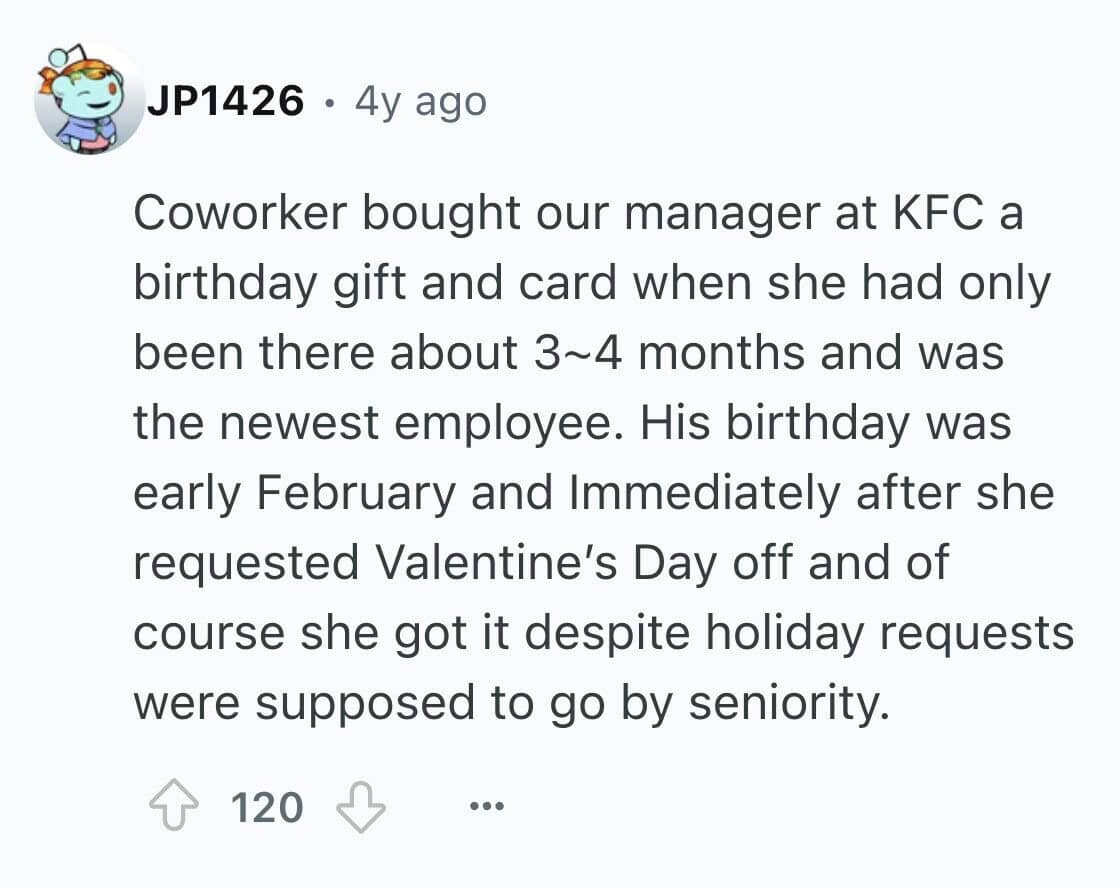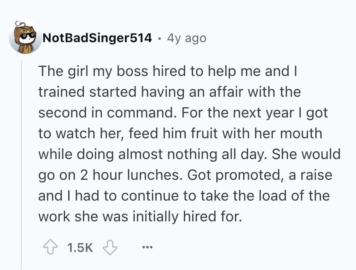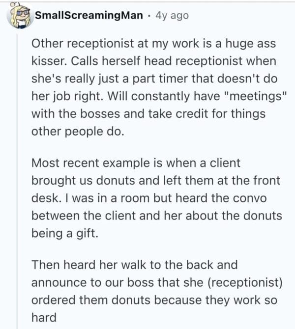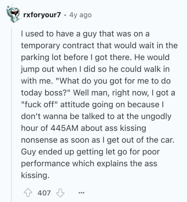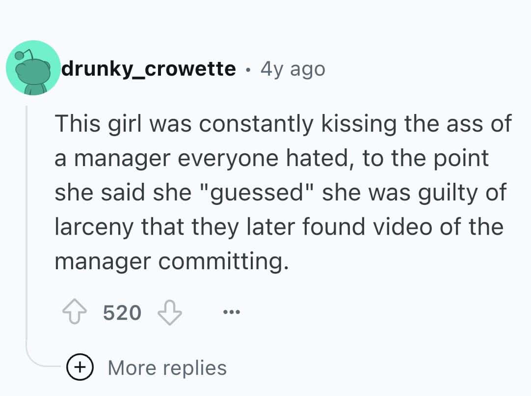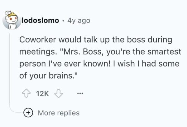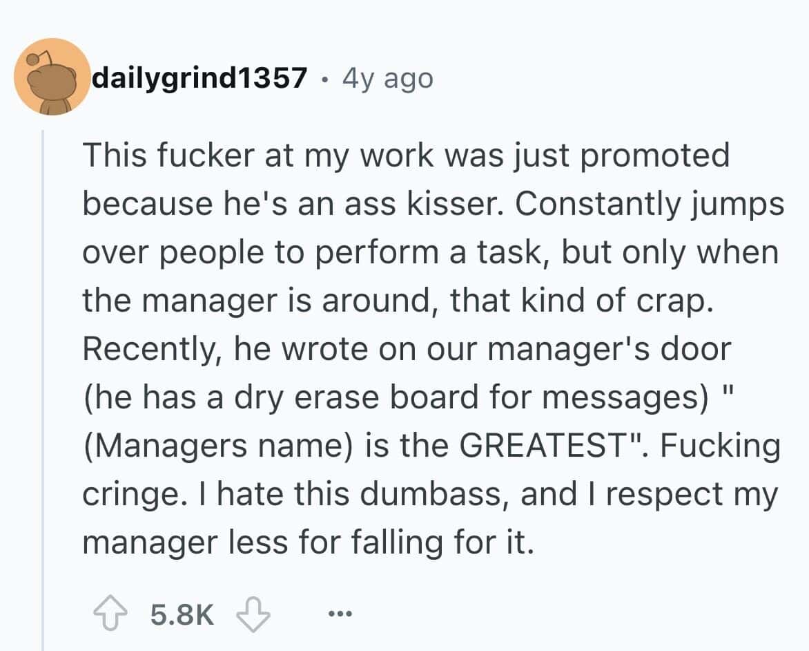 Here are 25 brutally relatable tales of bad coworkers whose entire personality revolves around pleasing the higher-ups at the expense of human decency. These suck-ups have done it all—ratted people out, taken credit for group work, and brought in cupcakes with creepy levels of enthusiasm. You'll see firsthand how a brown-noser can derail an entire office vibe with just one well-timed “As per my last email...” If you’ve ever had a coworker who would sell you out for a gold star or worse, a LinkedIn endorsement, these stories are your therapy session.