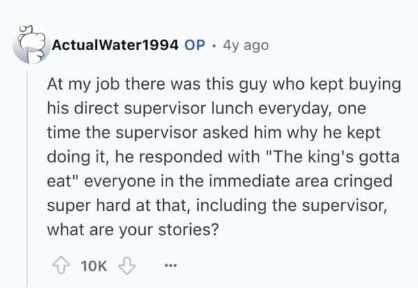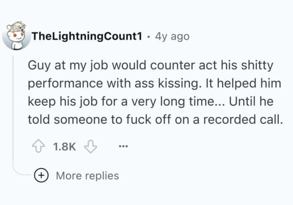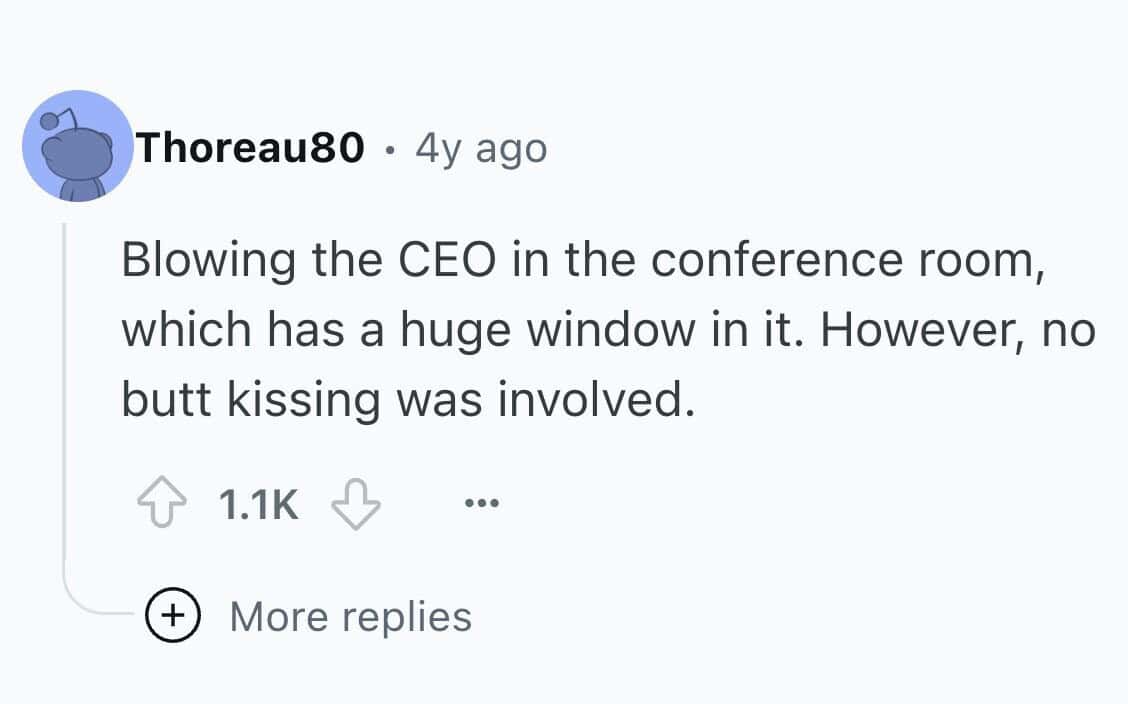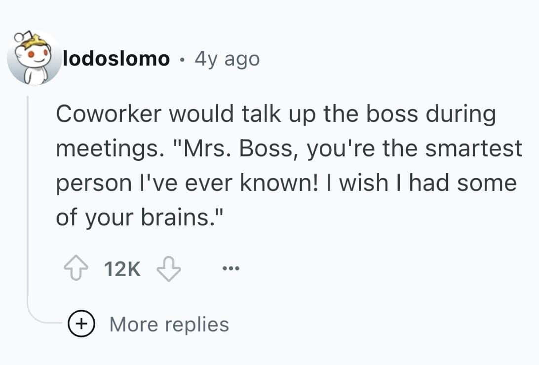Ah yes, the office suck-up. That rare species who thrives on approval and has somehow mastered the art of laughing at jokes that aren’t funny—loudly, and within earshot of the boss. We’ve all had one in our lives. You know the type: they're one motivational quote away from printing out a "world’s most loyal employee" mug for themselves. These stories will remind you why you sit at the edge of every Zoom meeting with your camera mysteriously “not working.”