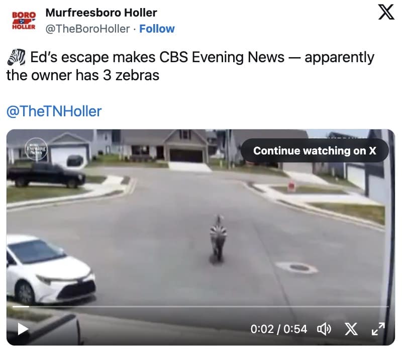 Why does the internet care? Because Ed embodied pure chaos with zero political baggage—just stripes and vibes. Each new sighting fueled fresh jokes about stealth technology (“Nature’s QR code remains undetected!”) and Tennessee tourism slogans (“We have everything, including unexpected zebras”). With a storyline featuring suburban strolls, highway sprints, and Disney-grade airlifts, Ed the Zebra memes hit the algorithm’s jackpot: animals plus absurdity equals infinite shareability.