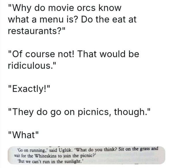 LoTR memes are a sacred tradition in fandom, right up there with arguing about Tom Bombadil and reciting every Aragorn quote out loud. In this gallery, you’ll find 30 epic picks—ranging from book memes to Lord of the Rings movie memes to the latest Tolkien memes that have invaded social media. These are the jokes that pop up in your group chat after every rewatch or when someone claims they can “handle the ring.” If your love language is inside jokes about hobbits, orcs, and the ongoing trauma of the Eye of Sauron, this batch was forged in the fires of Mount Doom for you.