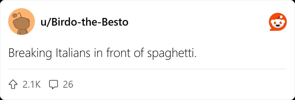 My parents came over randomly once when I was making pasta and my "half Italian" father started flipping out about snapping the noodles in half. Didn't like it when I pointed out I wasn't making it for him and it didn't change anything about the spaghetti I made.