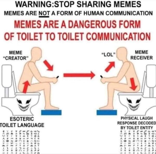 A weird meme explaining that memes are a dangerous form of "toilet to toilet communication."