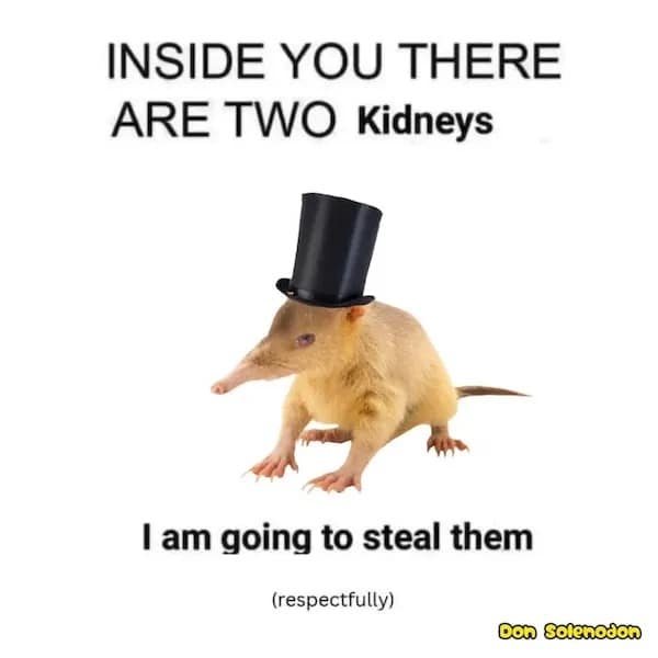 A funny meme about forgery featuring a cute opossum holding a bag of money.