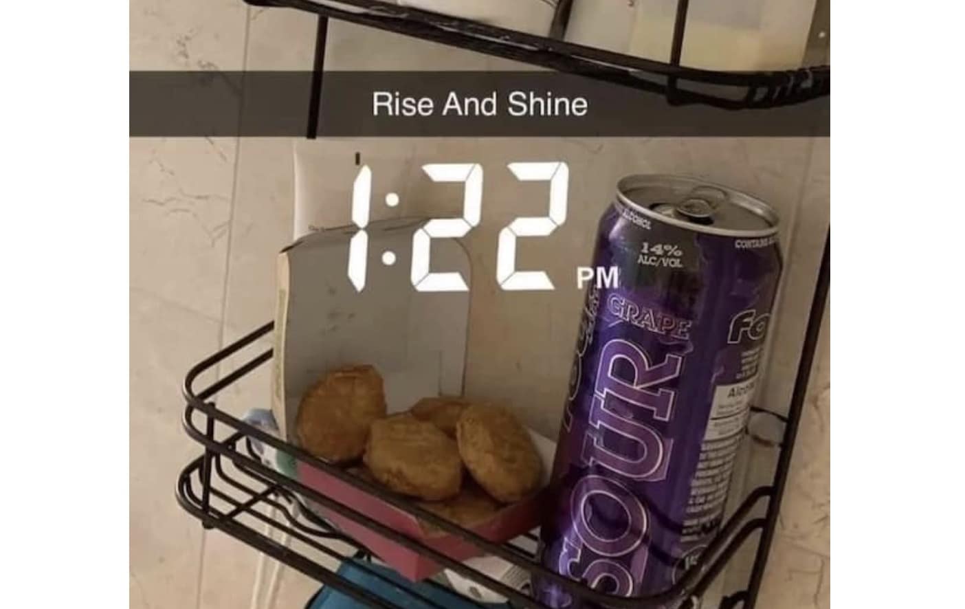 A cursed image of chicken nuggets and a Four Loko in a shower caddy.