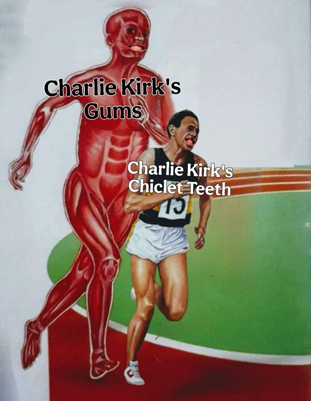 A weird and funny pic showing a surreal meme about a girl running from a creepy man Charlie Kirk.