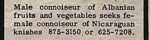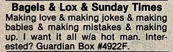 Of course, some entries veer fully chaotic. The weird dating ads with non-negotiables like “must enjoy taxidermy” or “no ghosts” feel tailor-made for your group chat. But they’re weird in a wholesome way; you can sense the hope humming underneath the nonsense. That’s why vintage personal ads still slap: they’re earnest, funny, and weirdly familiar.