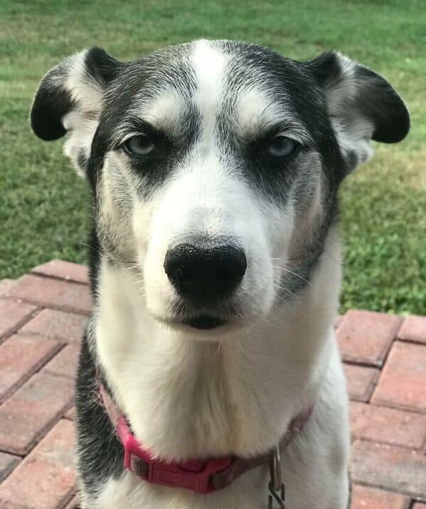 Four-photo collage of a husky making different unimpressed and confused faces.