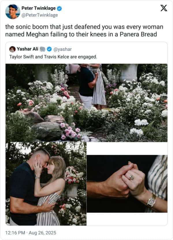 This engagement announcement wasn’t just personal—it was eventized. It fused romantic spectacle with sports-world bigness, so the reactions and memes multiplied like confetti in a wind tunnel. Even folks who swear they don’t care suddenly “don’t care loudly,” which is internet for “refreshing every 30 seconds.” Meanwhile, Taylor Swift engaged memes picked up the baton for anyone who only logs on to roast love itself.