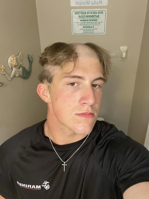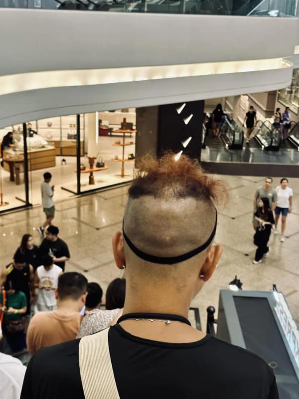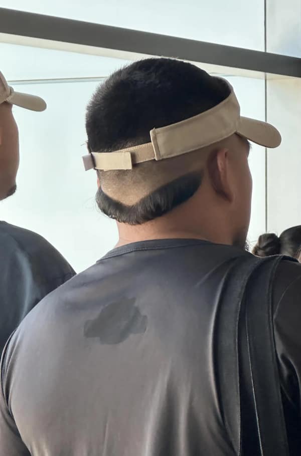 Back view of a man with a bowl-cut ring on top and shaved nape, leaving two dark tufts near the ears.