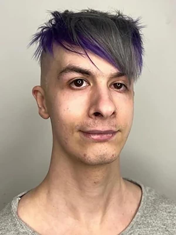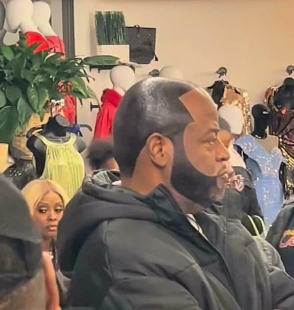 Man in profile with extreme skin-fade shaved to the scalp around the sides, leaving a narrow dark strip on top.