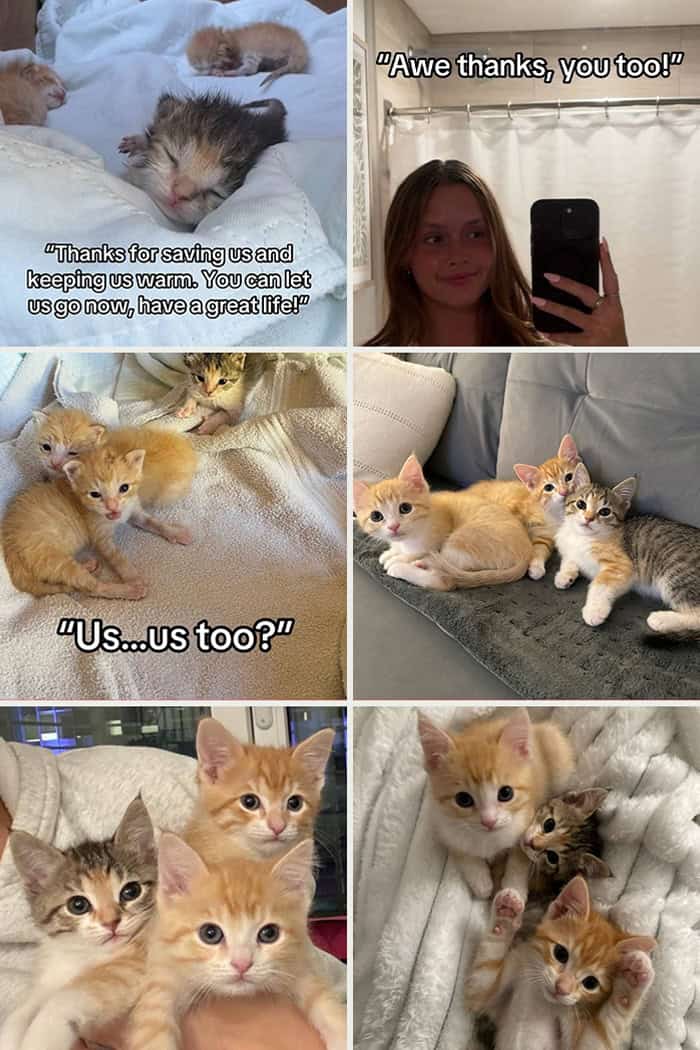 Dump-site kitten and her sisters rescued; later snuggled in warm beds as a trio
