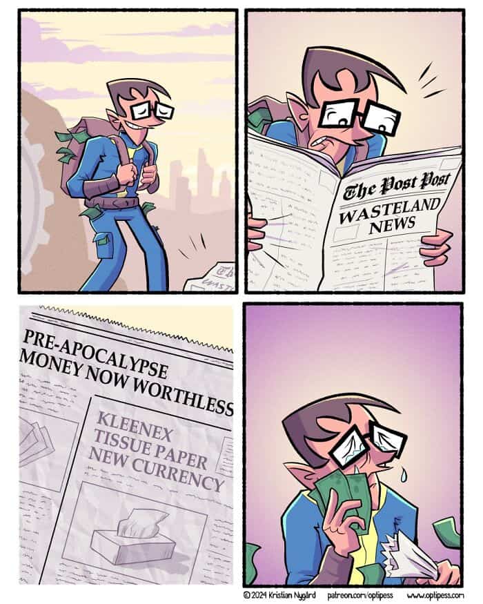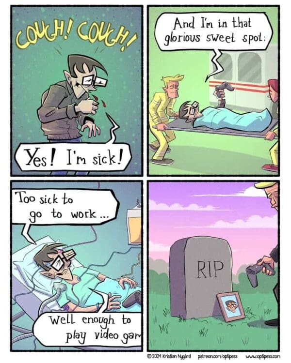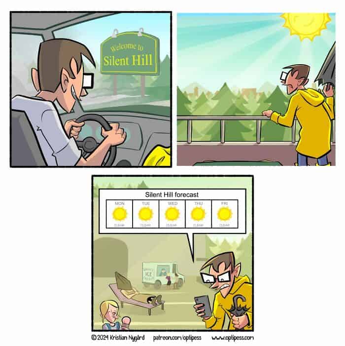 I am extremely brave until a four panel comic makes a sudden left turn and I yelp at my phone like it is haunted. Some people climb mountains, I casually scroll and get jump scared by a punchline. That is my Everest. The best part of these strips is the confidence, a sweet setup, a cleaner setup, then a rug pull so quick my dignity needs a seatbelt. I admire anyone who can land a surprise without shouting. It feels like a magic trick where the rabbit files a complaint. Today’s set is packed with comics with twist endings, the kind Kristian Nygard cooks up at Optipess where the final frame changes the room temperature. I keep telling myself I see them coming, then I do not, and I forgive myself by reading ten more. Consider this my formal apology to every barista who has watched me gasp‑laugh at a phone. Enjoy the reveals, then send one to the friend who pretends they do not flinch.