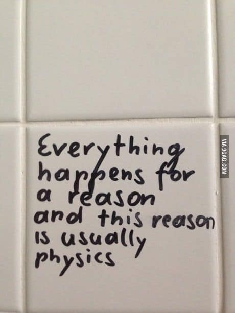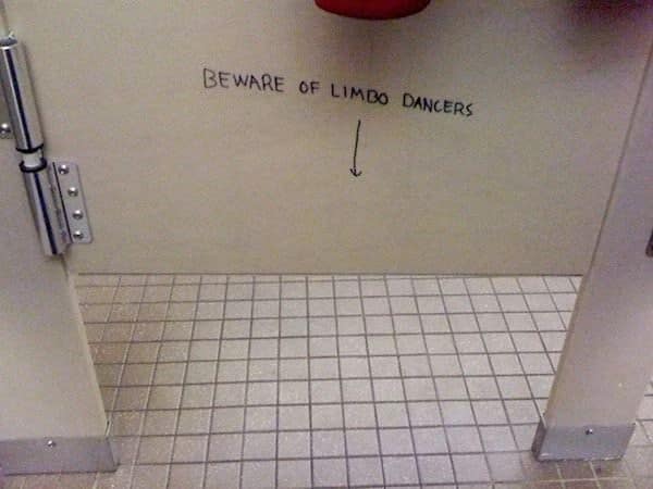 I once was in a toilet stall and saw some very small lettering written near the bottom of the stall door. I leaned over to read: “You are now crapping at a 45 degree angle.” Priceless!