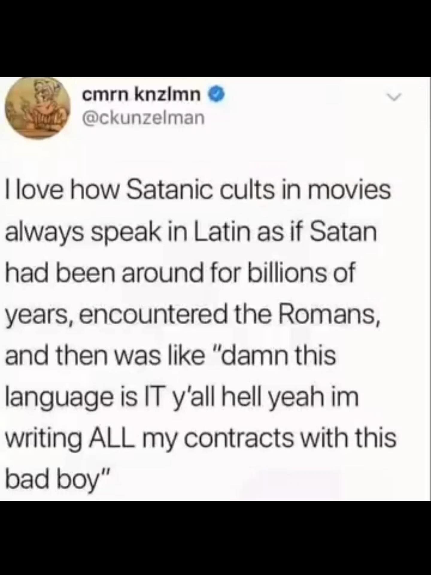 A funny and relatable tweet about being glad you never got any cringey or edgy teenage tattoos.
