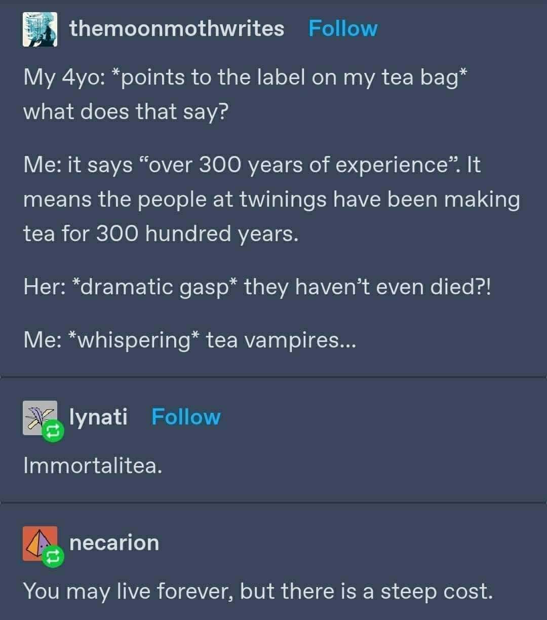 A pun meme joke about a magician who makes the "T" disappear from Tom's cup of tea.