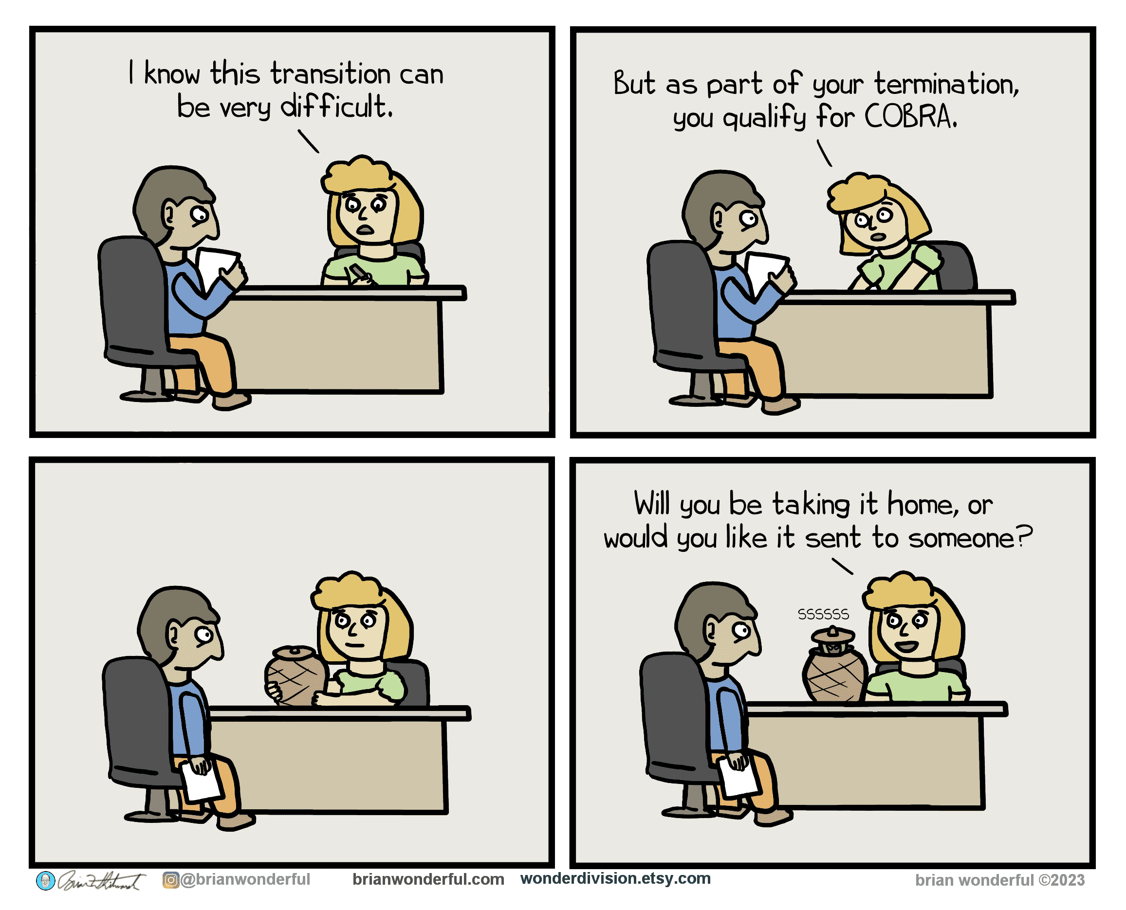 A relatable comic from Brian Wonderful showing the archetypes of a dysfunctional office, such as "Remaining Developer" and the Grim Reaper.