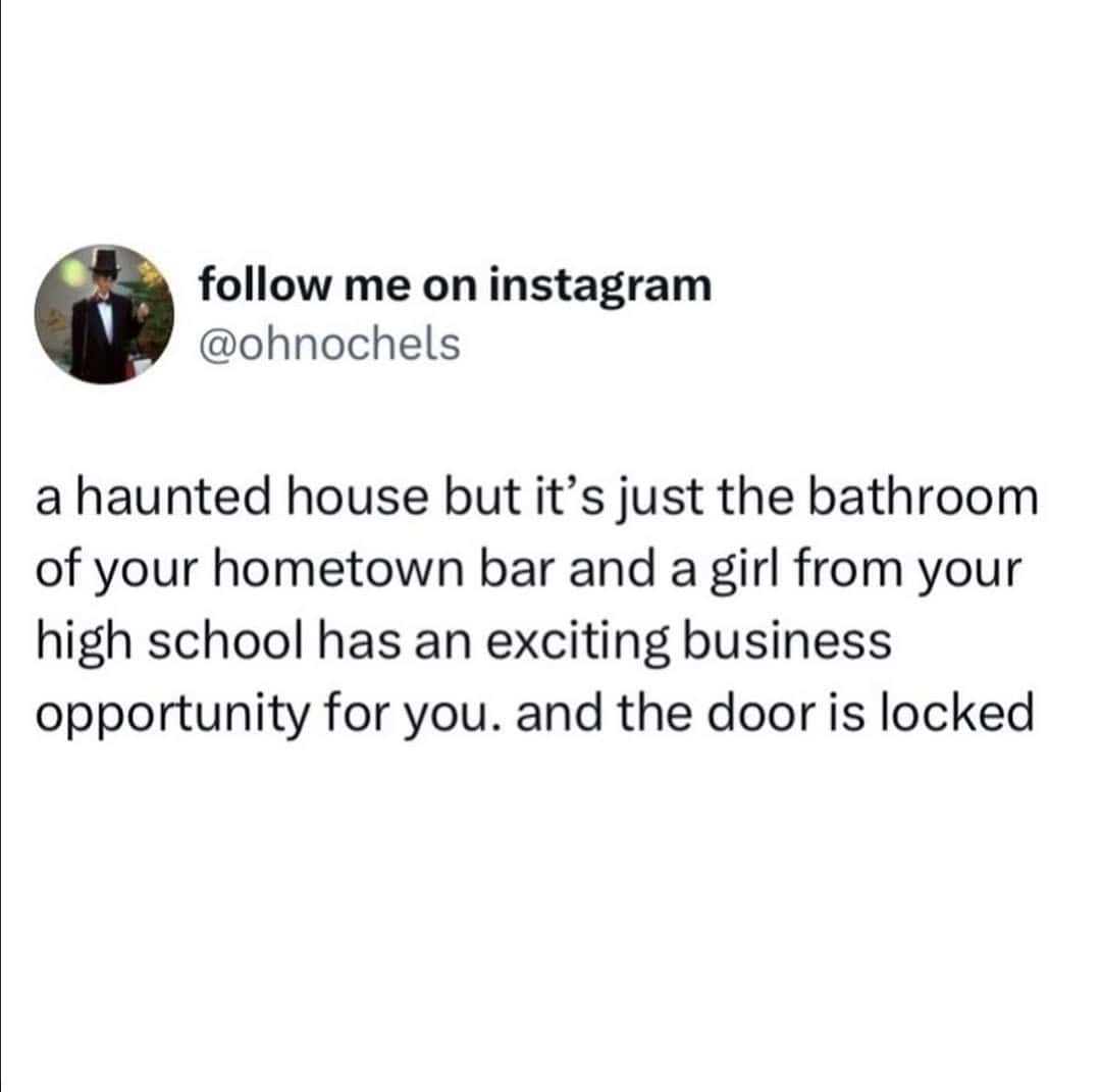 A funny tweet proposing a haunted house for adults that's just a room with a phone and a list of appointments.