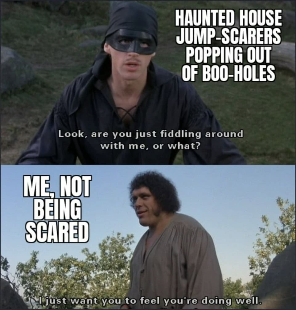 Fear is a theme park with surge pricing. We pay strangers to jump out at us, then complain about liability. I adore it. Haunted attractions are the only places where adults negotiate rules like children, do not touch me, do not run, do not embarrass me in front of the teenager in makeup. This gallery gathers haunted house memes that distill the negotiation, the pretend bravery that collapses at the first hiss from a fog machine. Somewhere in this intro I will use haunted house memes exactly once and you will hear a chain drag. The humor lives in the choreography, the conga line of friends, the sacrifice of the talker to the front, the scream laugh that becomes a memory. If you like fear in controlled environments with exit signs and snacks afterward, welcome. We have a wristband with your name on it.