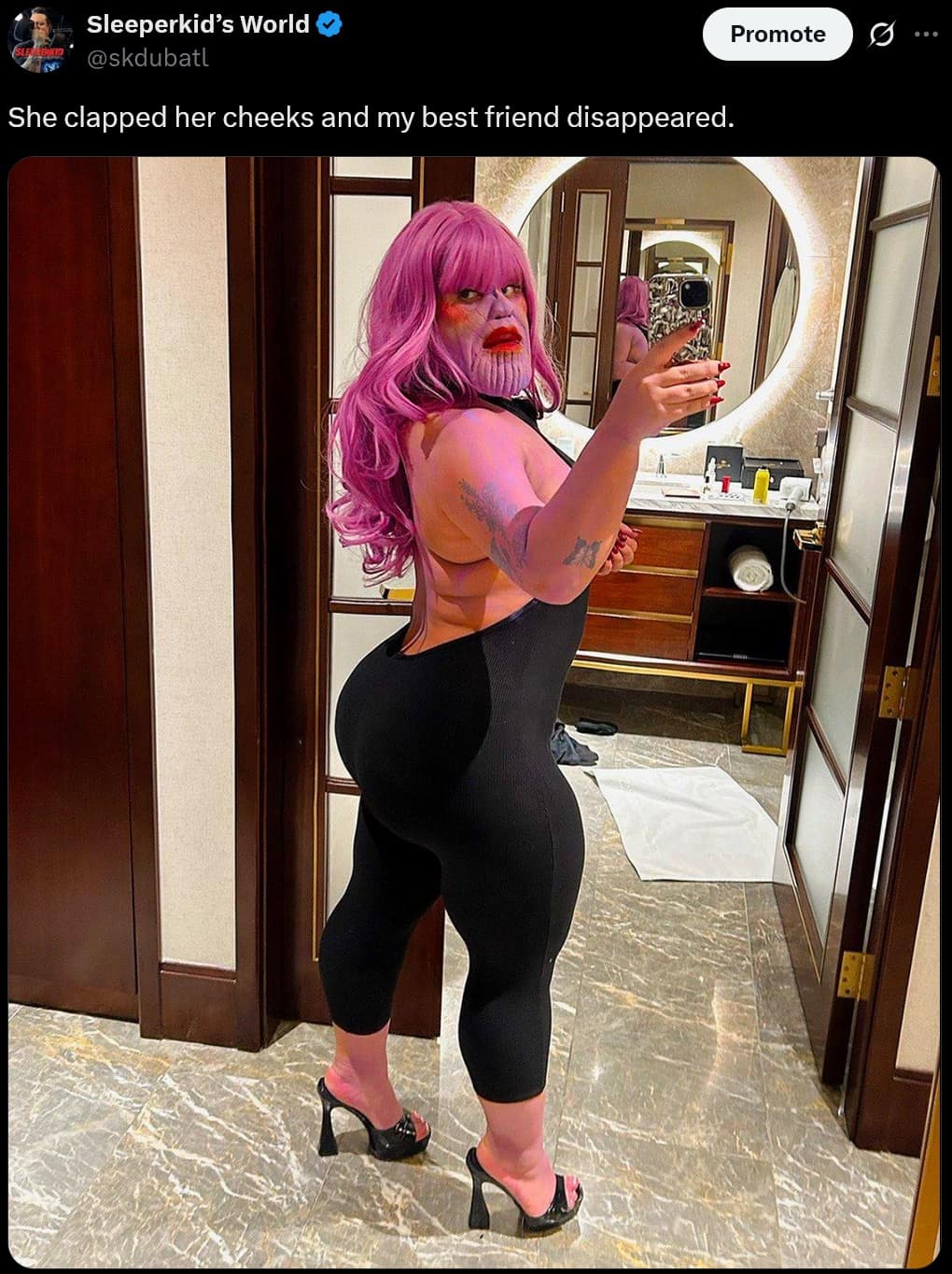 Funny tweet reacting to a New York Post headline about a man beaten up by 7 ladyboys in Thailand.