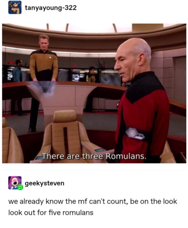 If you’re still coasting at impulse after these Star Trek memes, queue up 40 Sci-Fi Memes To Save For Warp Speed, 14 Space Facts That Still Engage, and 30 Mandalorian Memes To Chib Your Ronks.