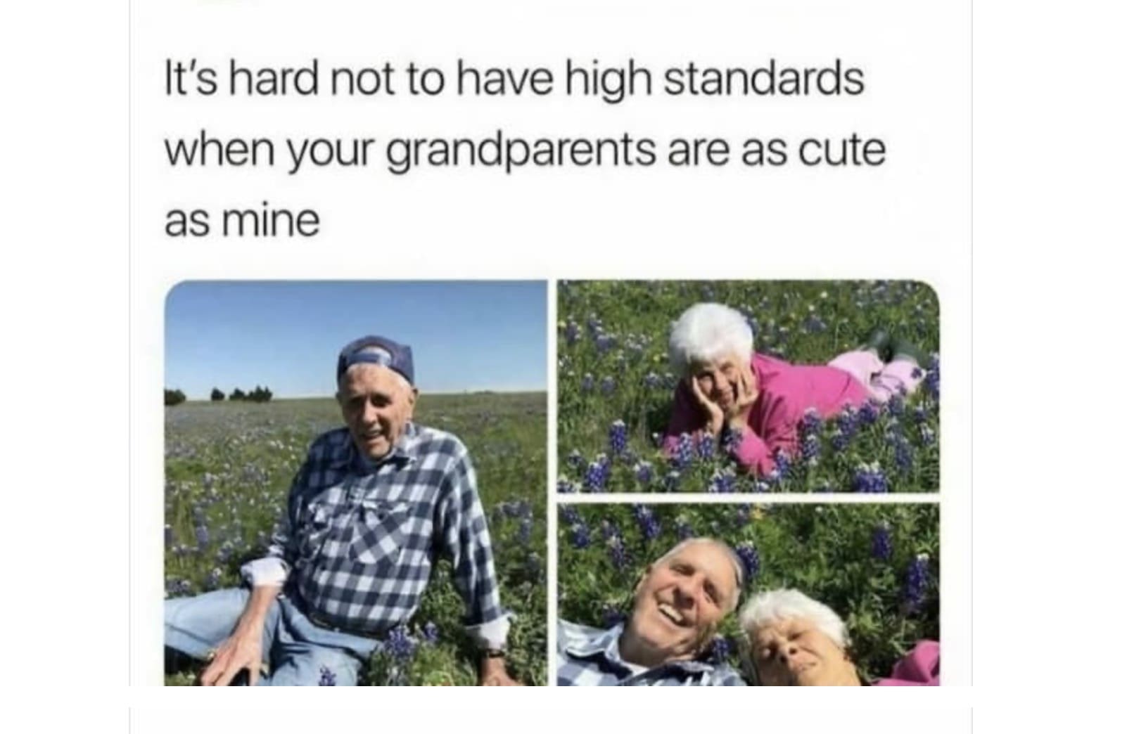 A wholesome tweet showing cute grandparents posing in a field of flowers, setting "high standards" for love.