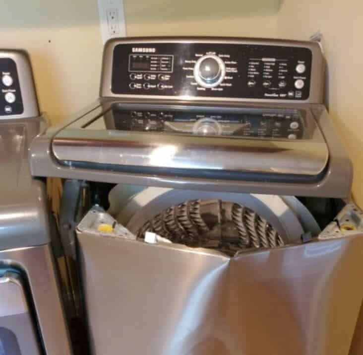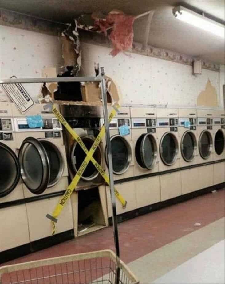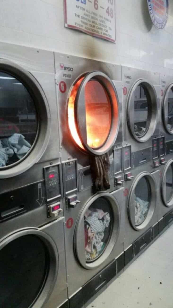Laundry fail showing a washing machine on fire after the first use