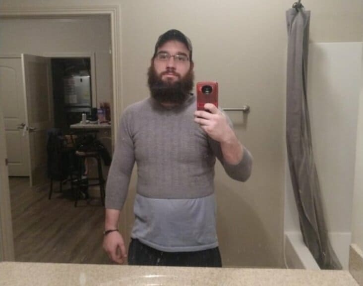 Laundry fail comparing a shrunk sweater to a phone for scale