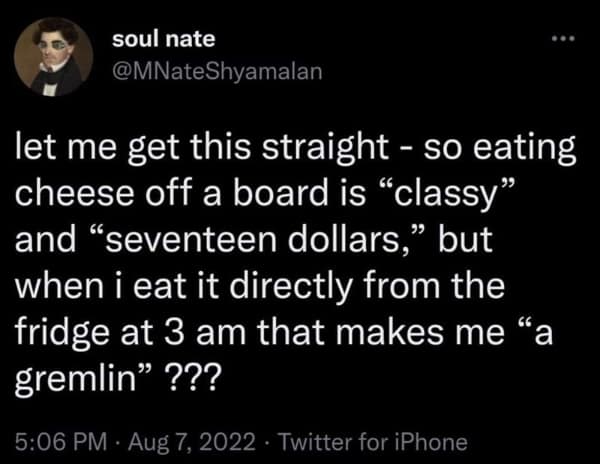 Midway, the chaos gremlins took over: midnight cheddar goblins, “I love cheese” shirts worn with alarming sincerity, and that one “Colombian cream cheese” joke that definitely wasn’t about bagels. The memes understand that sometimes dinner is simply crackers, a hunk of something sharp, and the soft apology of grapes.