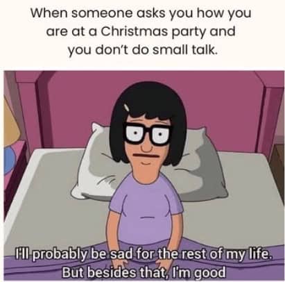 Once you scroll the full gallery, you realize these screenshots are basically holiday mood boards. SpongeBob hugging a deeply over-it Squidward-Santa is the exact energy of every office party where one coworker is aggressively festive and everyone else is thinking about Netflix and leftovers. Tina Belcher quietly spiraling through small talk at a crowded gathering might be the most accurate cartoon memes representation of social anxiety ever drawn.