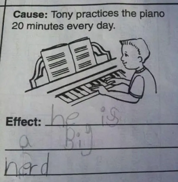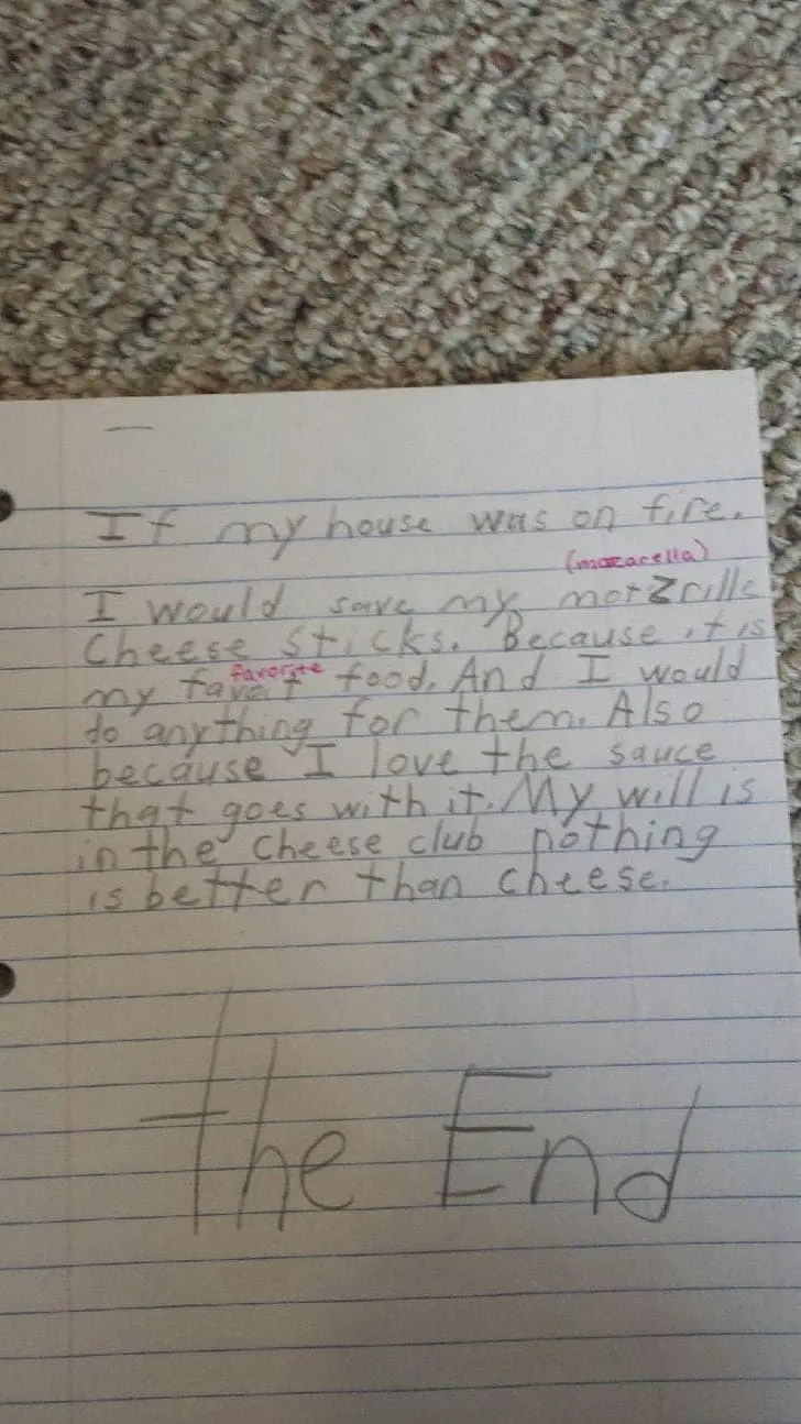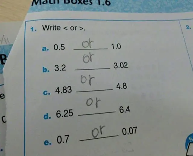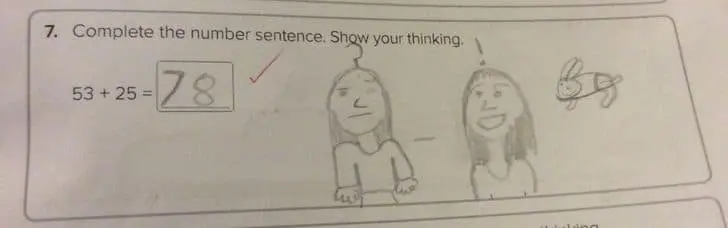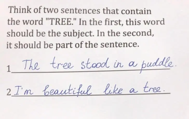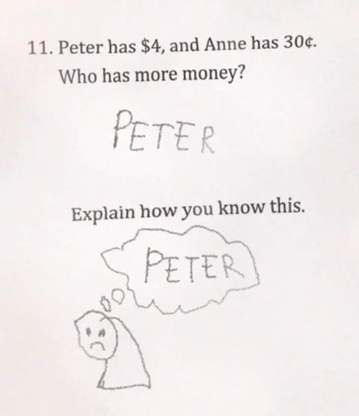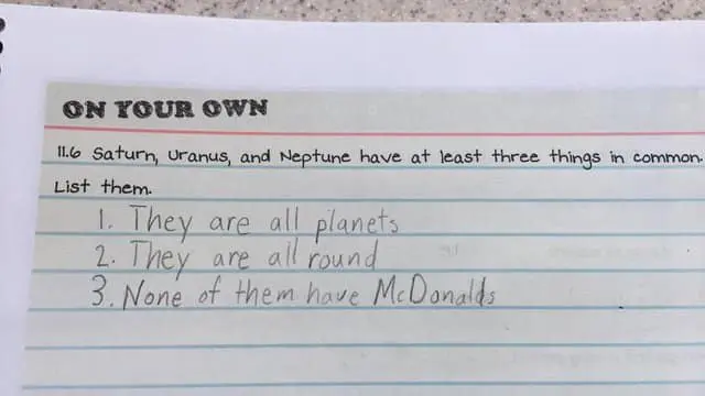 Funny kid test answers work because they reveal priorities. Why would anyone care about planets if there is no fast food there. Why show your work when the work is obviously math. Why sugarcoat an illustration when the boy is clearly chubby and the water is dirty. These answers are not malicious. They are efficient.