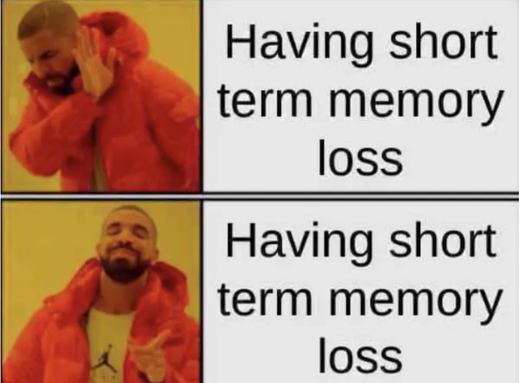 Drake Hotline Bling meme format repeating the same text about having short-term memory loss.