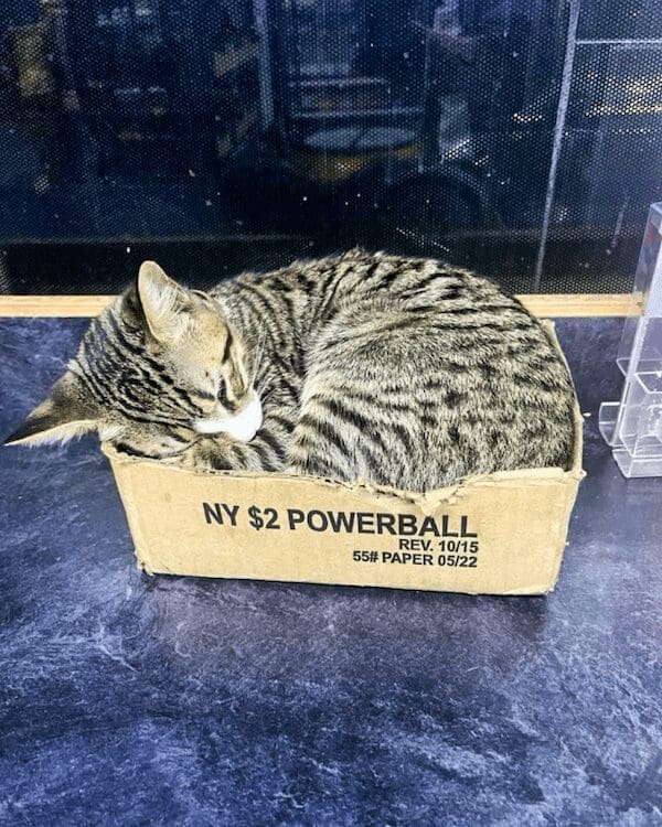 It’s the kind of scene you see in funny cat pictures and assume is staged… until a real-life shop tabby yawns in your face.