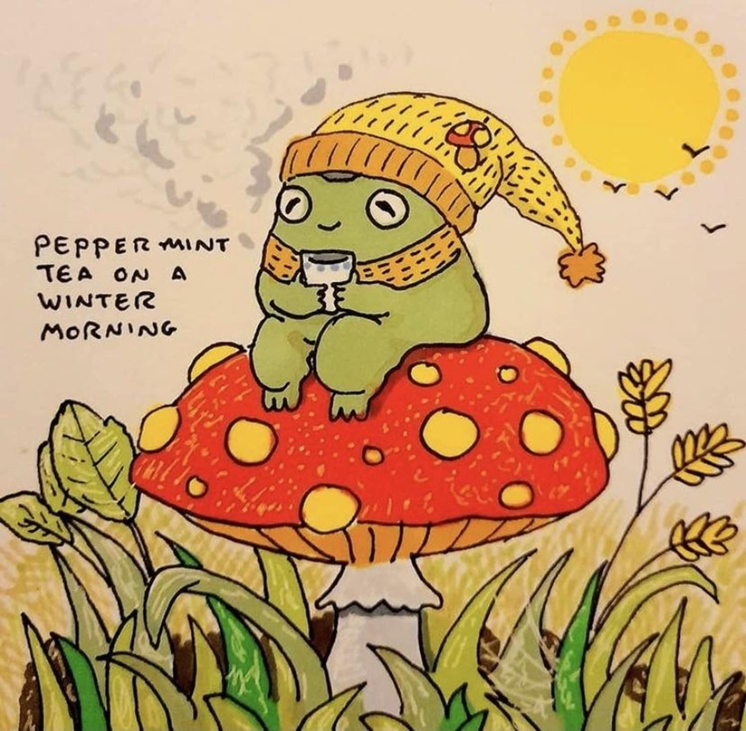 Then there are three frogs in knit hats giving you “permission to commit one war crime today.”