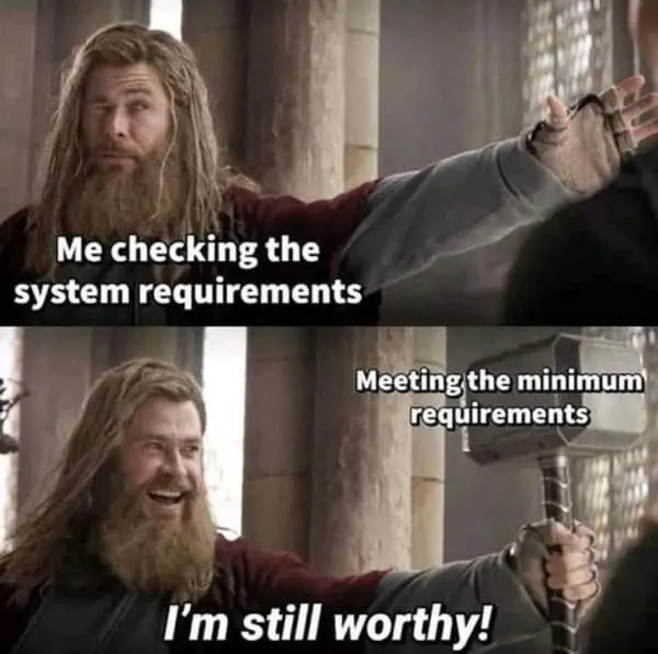 And to close the loop, there is a Thor reaction meme celebrating when your aging PC just barely meets the minimum system requirements for a new AAA title.
