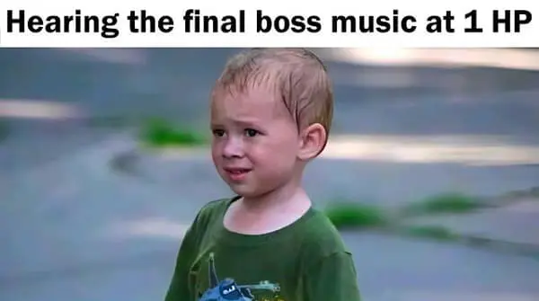 One gaming meme uses the classic sweating kid reaction to show the moment the music changes and the health bar appears while you are sitting at 1 HP and out of potions.