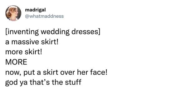 If you need more nuptial nonsense like these wedding memes, tap 43 Bride Memes For People On A Timeline, 35 Funny Marriage Tweets That Feel Like Evidence, and 31 Wedding Fails That Deserve A Support Group.