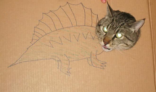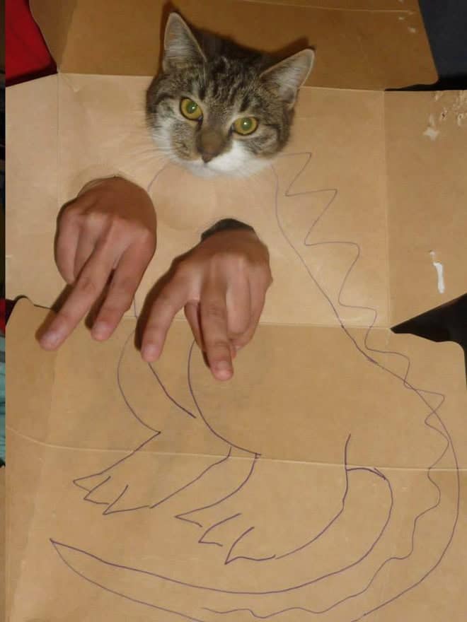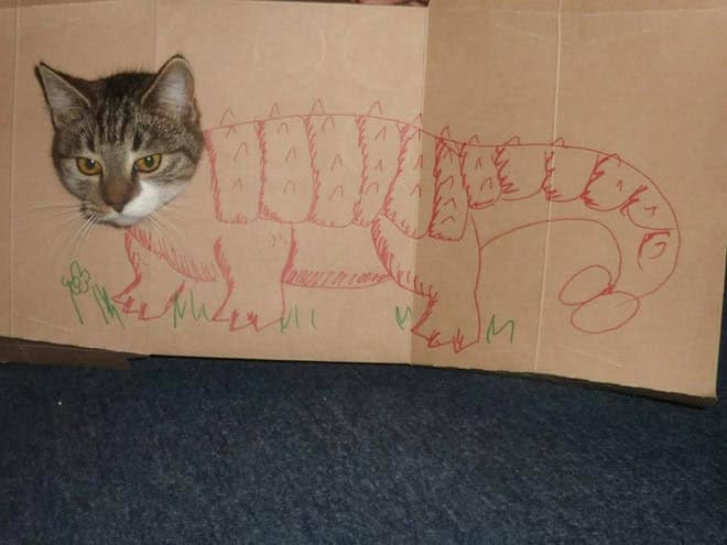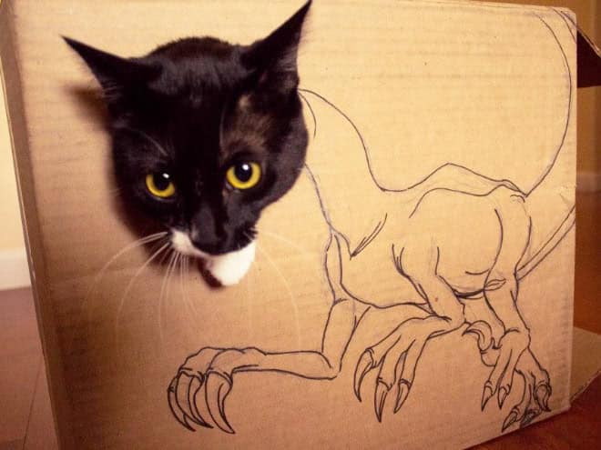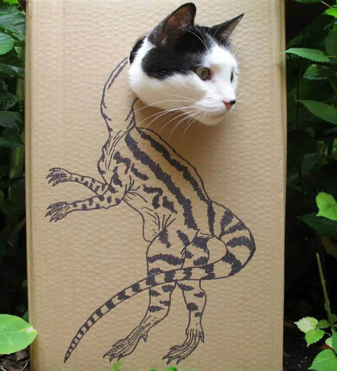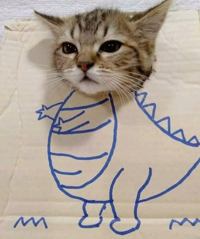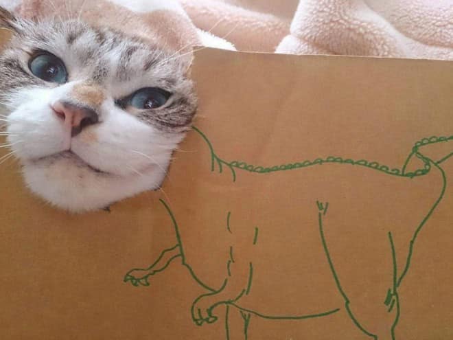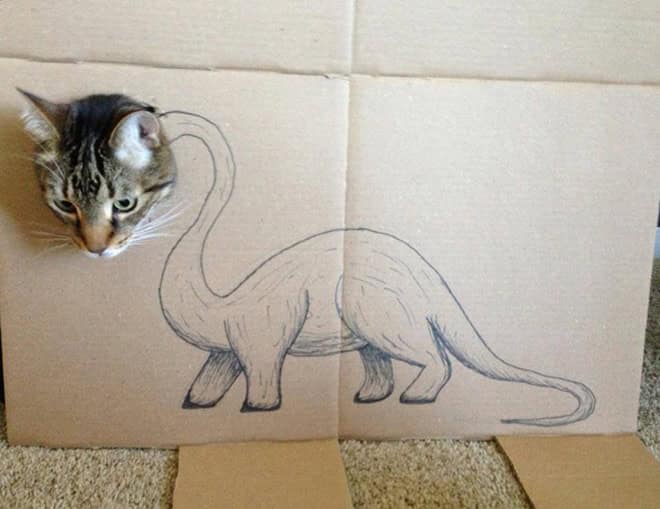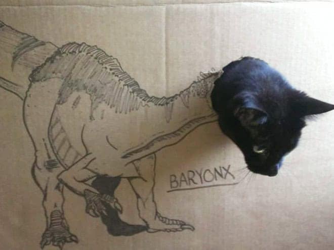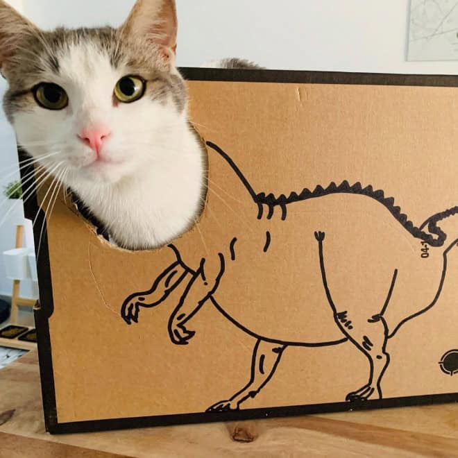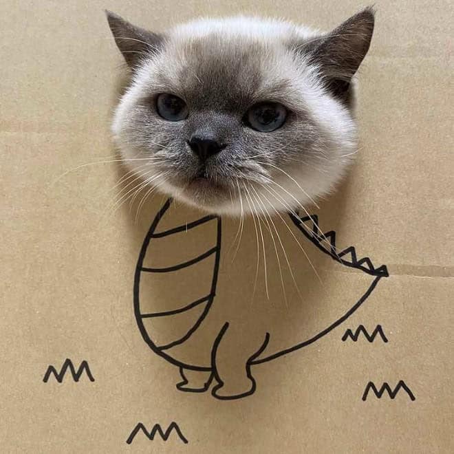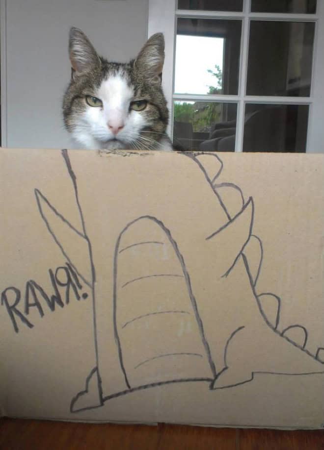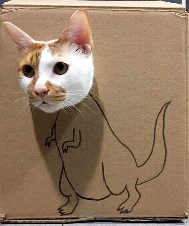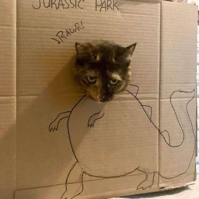 That contrast is what makes cardboard box cats endlessly funny. The drawings get more elaborate, the concepts get more ambitious, and the cats never change their expression. It becomes less about dinosaurs and more about how far people will go just to make their pet mildly interesting for ten seconds.
