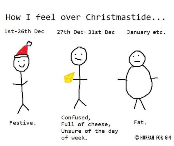 Some of the funniest ones aren’t even about drinking. They’re about the post-Christmas food hangover. The cat blissed out in a sea of empty boxes is the only creature thriving right now. And the e-card wishing “happy returns and refunds” is painfully accurate. Joy was yesterday. Today is customer service lines and receipts.
