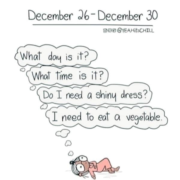 There’s also a Santa recovery panel that feels like a documentary. Santa on December 26 looking wrecked and smoking? That’s every parent after assembling toys at 2 a.m. And the dead-tree sadness text about December 26 “let down day” hits harder when you can still hear the wrapping paper in your nightmares.