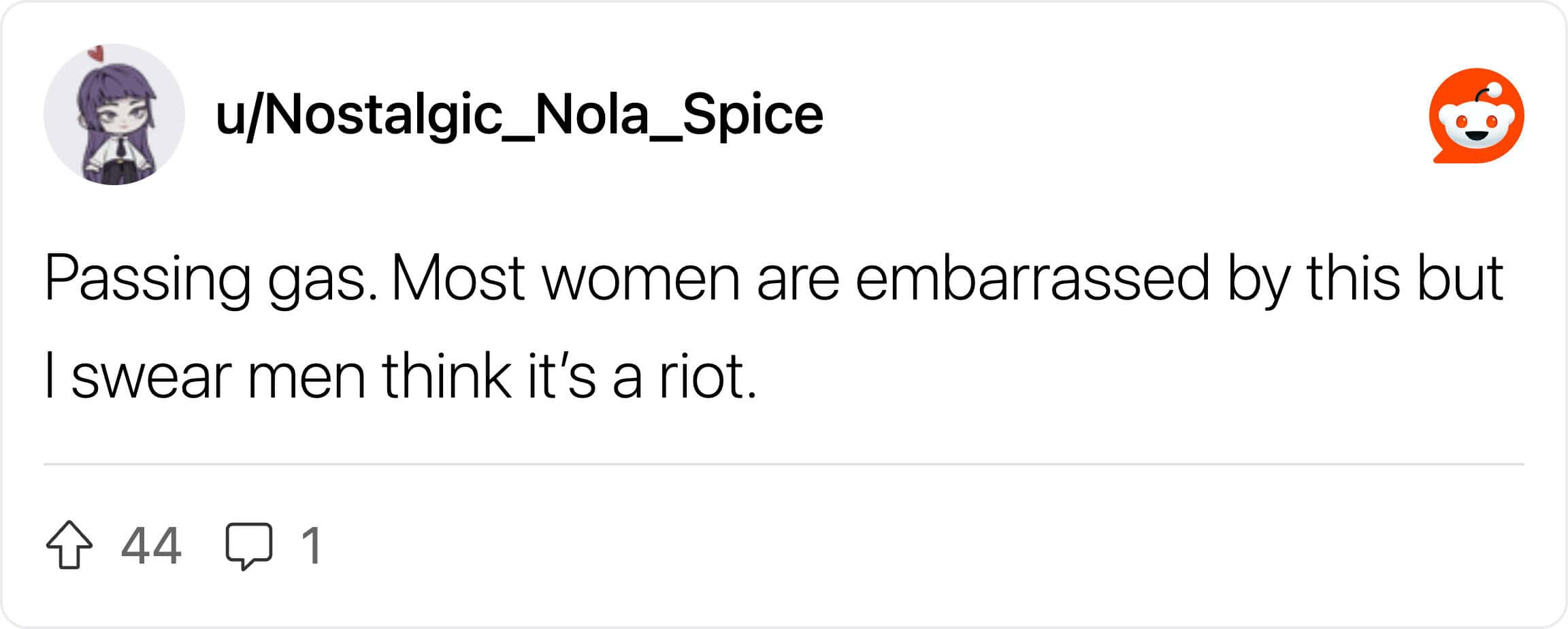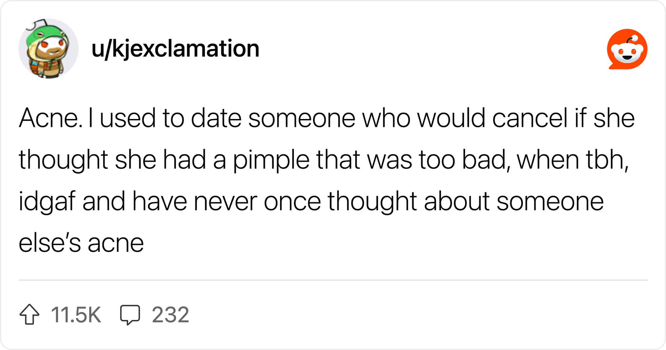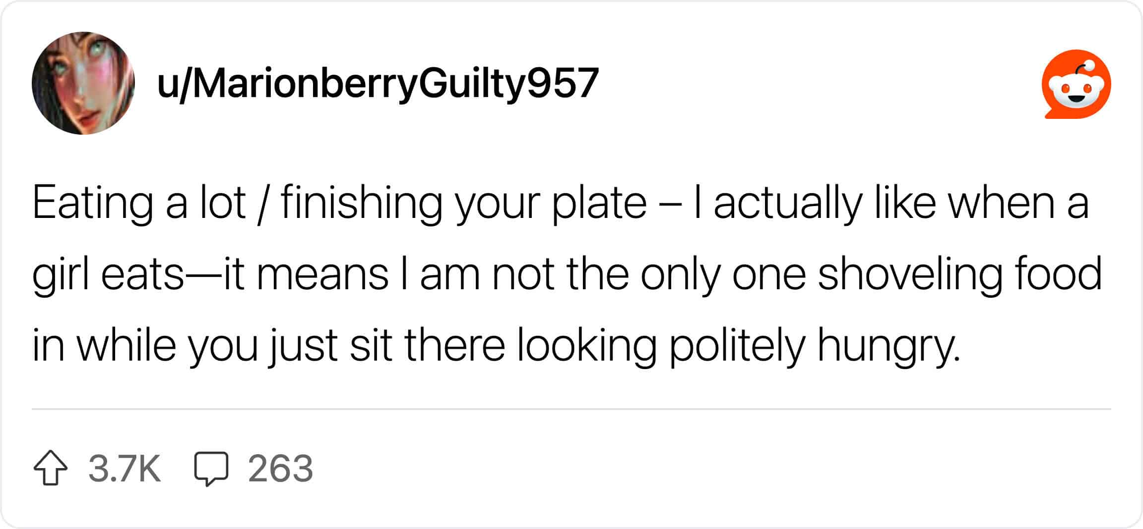 Reading through this thread of guys confessing what they don’t care about is actually pretty wholesome. It turns out, all that anxiety about being “ladylike” is mostly internal. Guys are listing things like “snorting when laughing” or “wearing comfortable underwear” and universally agreeing: it doesn’t matter. In fact, a lot of dudes find the things you think are embarrassing to be kind of endearing.