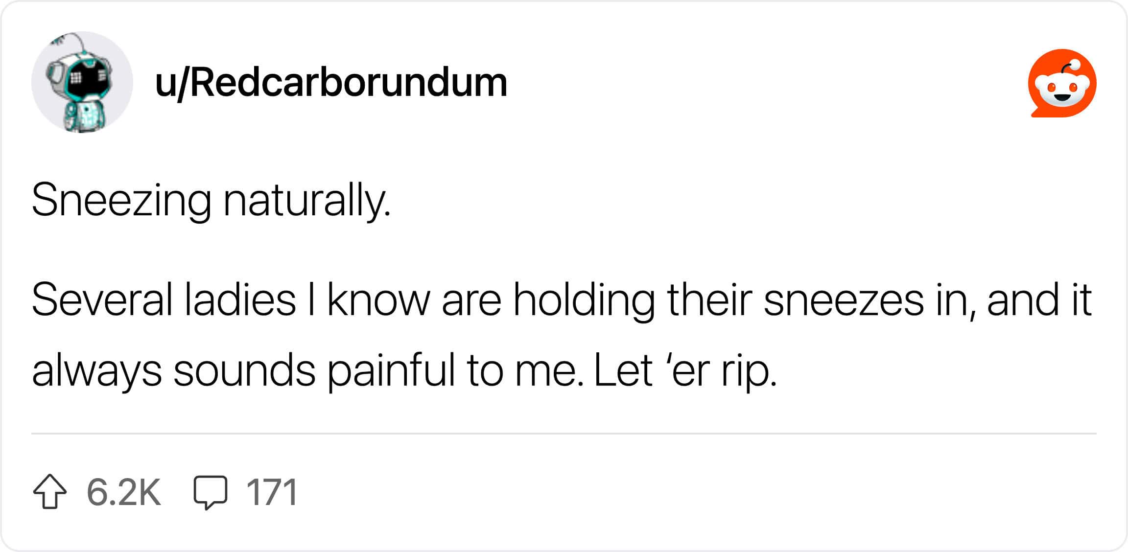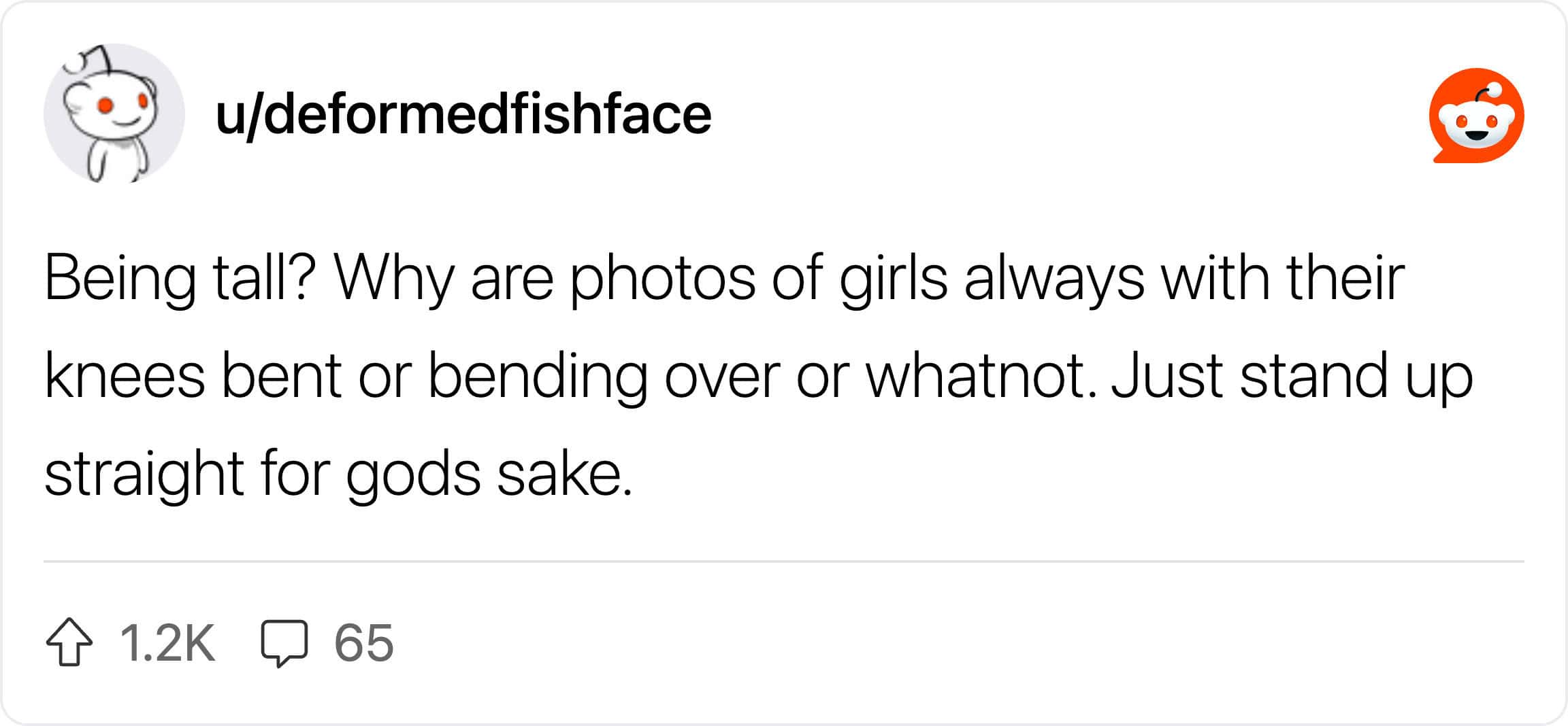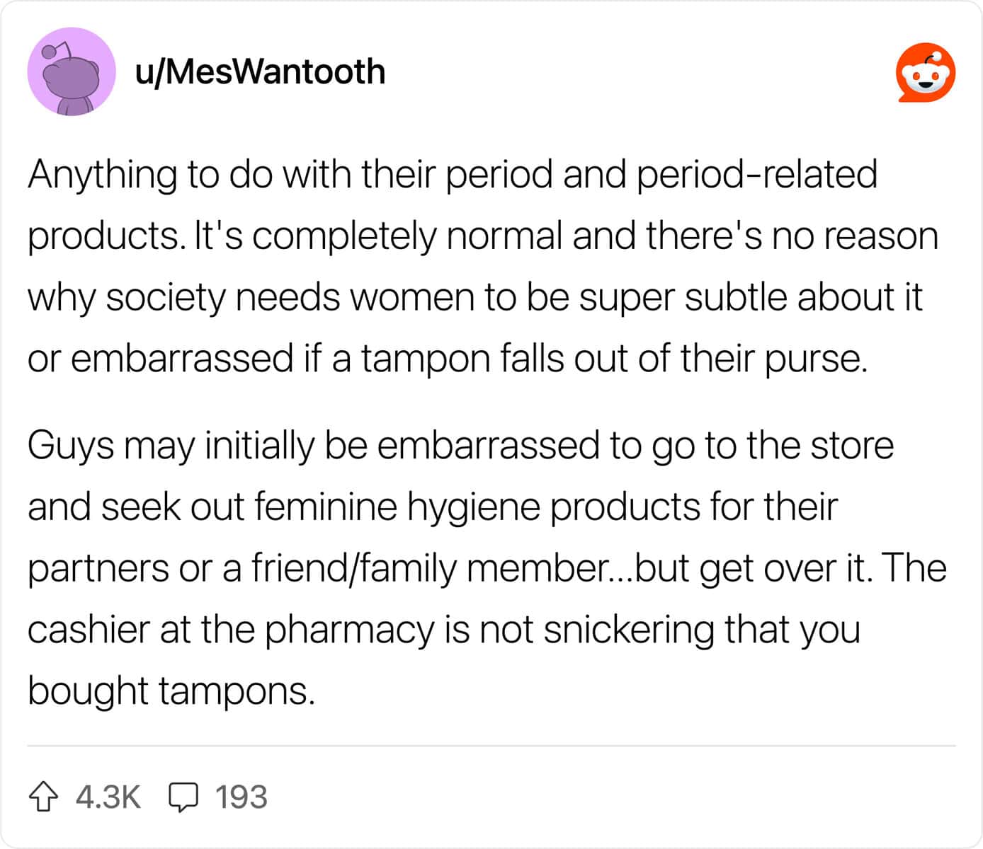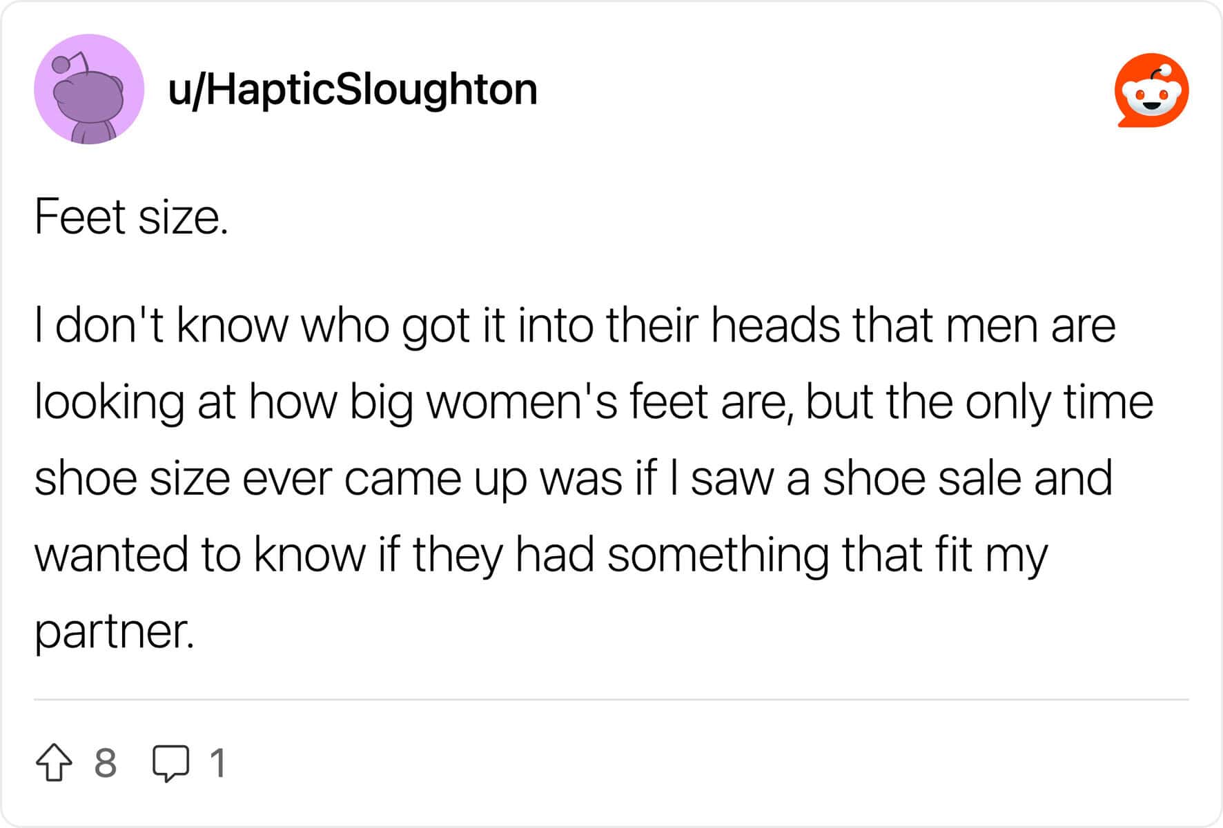 Reading through this thread of guys confessing what they don’t care about is actually pretty wholesome. It turns out, all that anxiety about being “ladylike” is mostly internal. Guys are listing things like “snorting when laughing” or “wearing comfortable underwear” and universally agreeing: it doesn’t matter. In fact, a lot of dudes find the things you think are embarrassing to be kind of endearing.