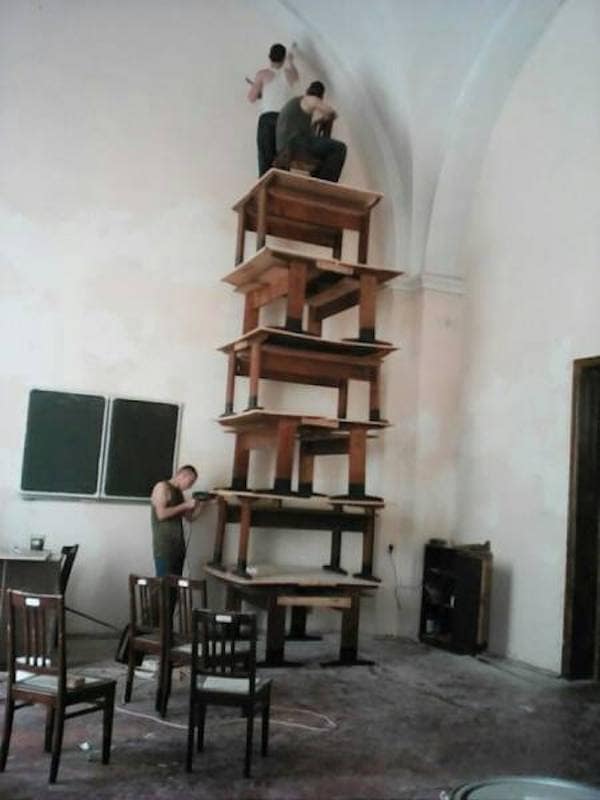 I need to go lie down after seeing those. It is a miracle that the human race has survived this long when we have people using excavators as elevators. It really shows you the lengths people will go to avoid renting the proper equipment. “Why pay for scaffolding when I can just stack three tables and a chair?” Because you will die, Dave! That is why!