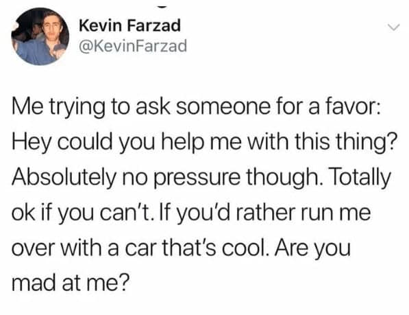 The “apologetic ask” tweet is painfully accurate. You start with a favor and end by saying “no worries if not!! also you can hit me with your car.” Anxiety memes really capture how we try to be polite and accidentally become a hostage negotiator.