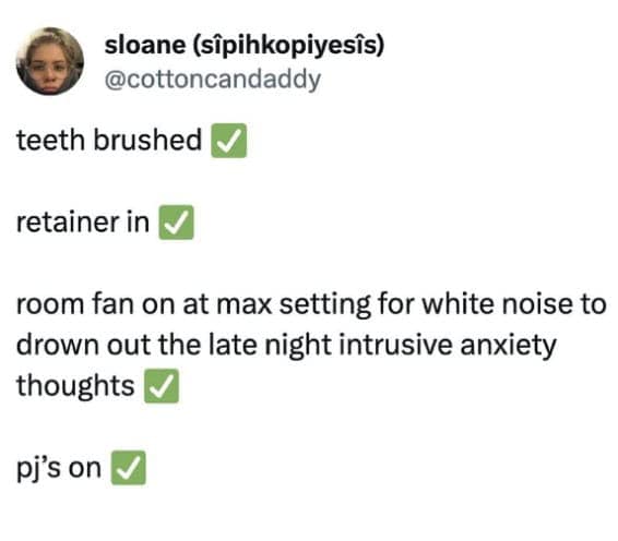 Bedtime gets its own chapter too: teeth brushed, pajamas on, fan set to jet engine so your intrusive thoughts can’t get a word in. That’s not a routine. That’s a containment strategy for overthinking.